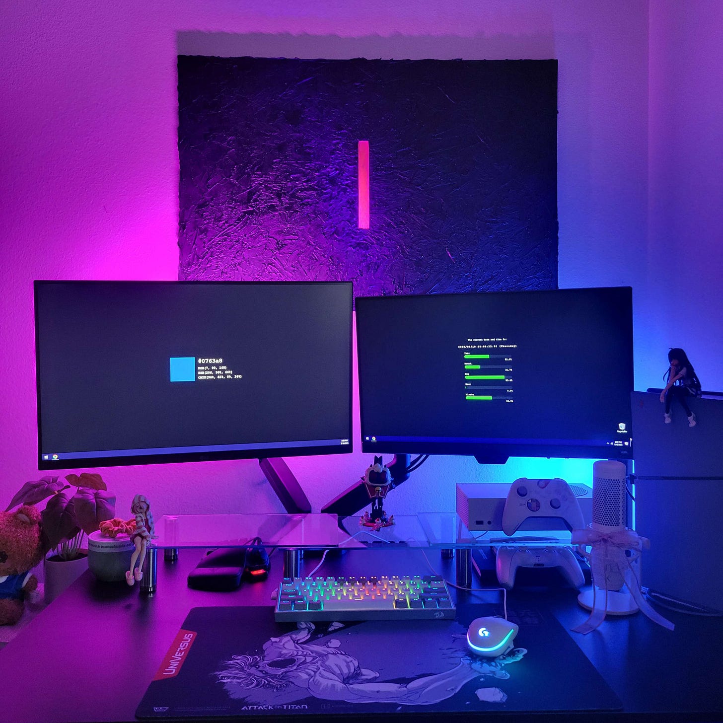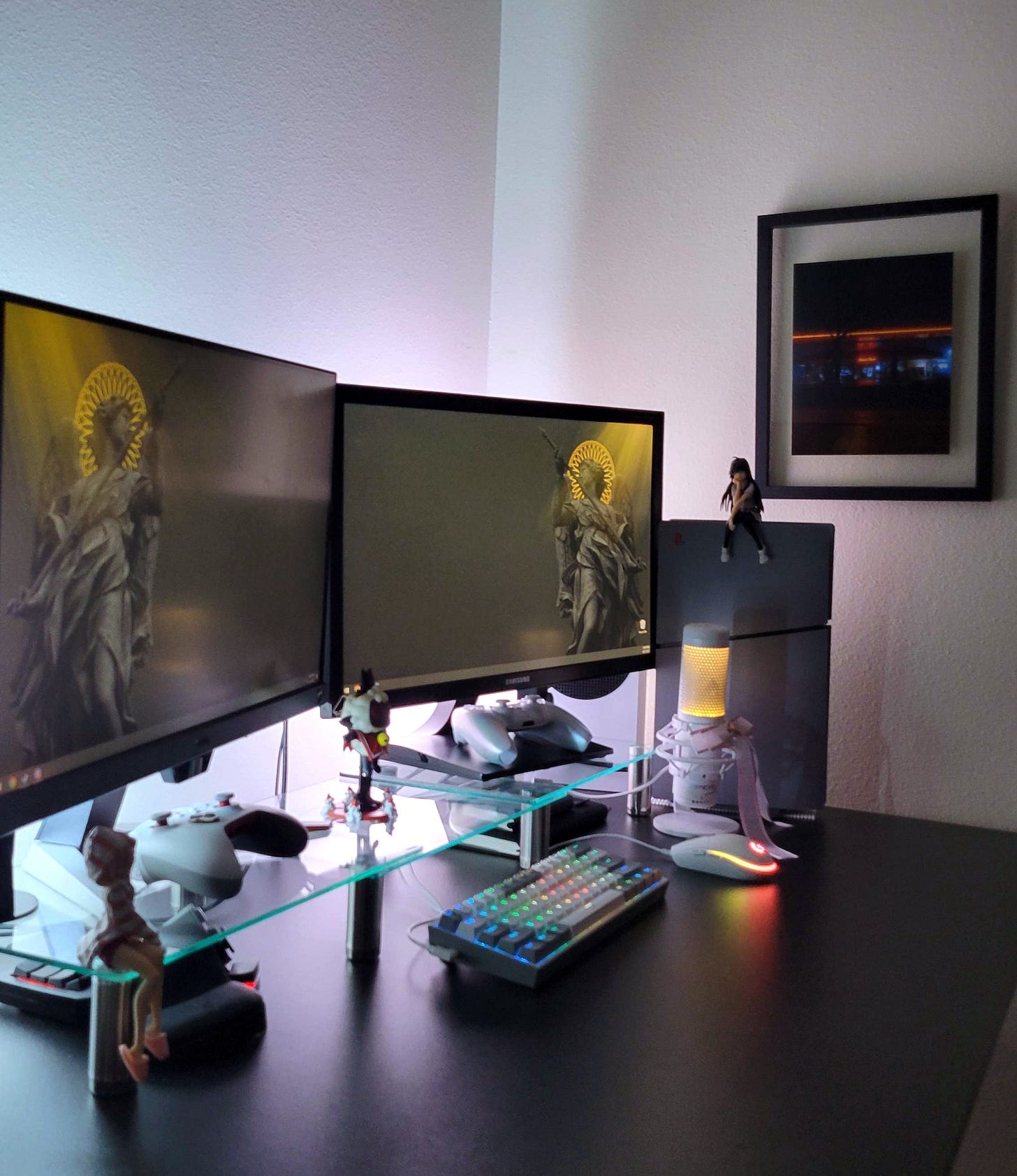 Im keeping the main components of the desk: dual monitors with risers, ps5, xbox s, small decor. I’m unsure if I want to dedicate myself to a color scheme, but right now I’m aiming for black & white with glitch highlights aka magenta and blue. I have my gorgeous Kwik Trip photo taken by thecolorfulkid, but I have a blank space directly behind my monitors.